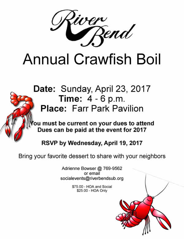 Riverbend Annual Crawfish Boil - Sunday April 23, 2017